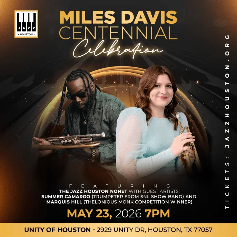 Miles Davis Centennial Celebration Saturday, May 23, 2026 7:00 PM 8:30 PM Unity of Houston 2929 Unity Drive Houston, TX, 77057 United States (map) Google Calendar ICS TICKET INFO
